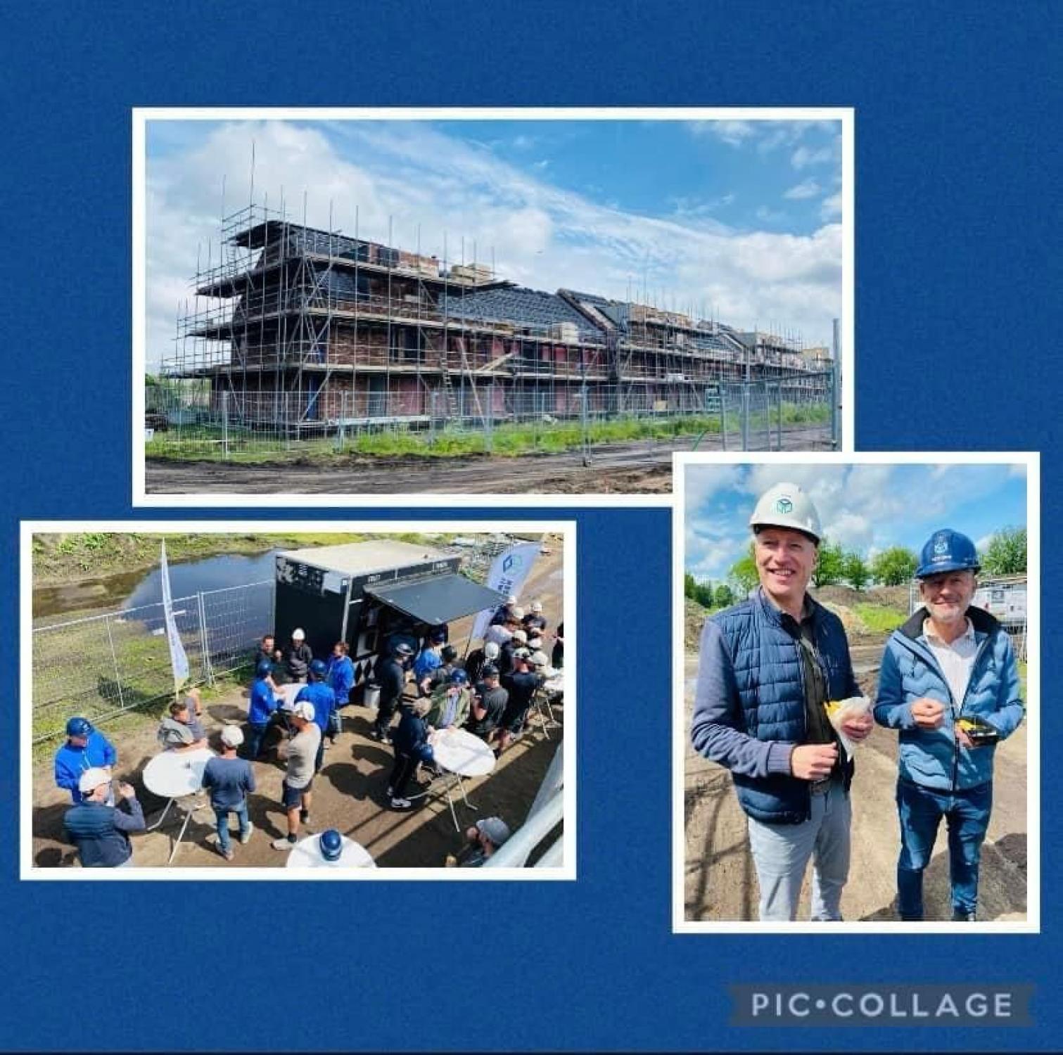 In opdracht van Goed Wonen realiseren wij 23 woningen in het uitbreidingsplan Doonheide II. Het project bevindt zich in dezelfde wijk waar we eerder dit jaar al 18 appartementen hebben voltooid. Dat de vaart er goed in zit, mochten we vandaag vieren: het hoogste punt is bereikt! De tevreden opdrachtgever was met een aantal collega’s aanwezig om deelgenoot te zijn van het ondertussen traditionele friet- en snackmoment voor alle hardwerkende vaklieden. Naar verwachting leveren we in oktober van dit jaar op. Een woord van dank aan Goed Wonen voor de traktatie!
