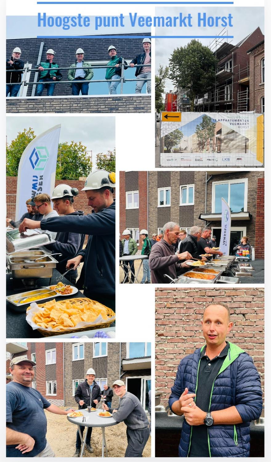 Op de plek van de voormalige bakkerij zijn wij in het centrum van Horst bezig met de realisatie van 12 sociale huurappartementen voor Wonen Limburg. In december 2023 werd het startschot gegeven en zijn we begonnen met de nieuwbouw. Alhoewel het hoogste punt in april bereikt werd, vieren we vandaag de vorderingen van dit project. Namens opdrachtgever Wonen Limburg, sprak projectleider Theo Janssen een dankwoord uit voor het werk van alle vaklieden. Samen met Wonen Limburg trakteerden wij op een Chinees buffet. We bouwen immers al geruime tijd naast het plaatselijke Tin Sun dus hebben we daar natuurlijk voor deze gelegenheid een samenwerking mee opgezocht. Het eten viel goed in de smaak en werd zeer gewaardeerd door de aanwezigen! We verwachten de appartementen in het najaar van 2024 op te leveren.