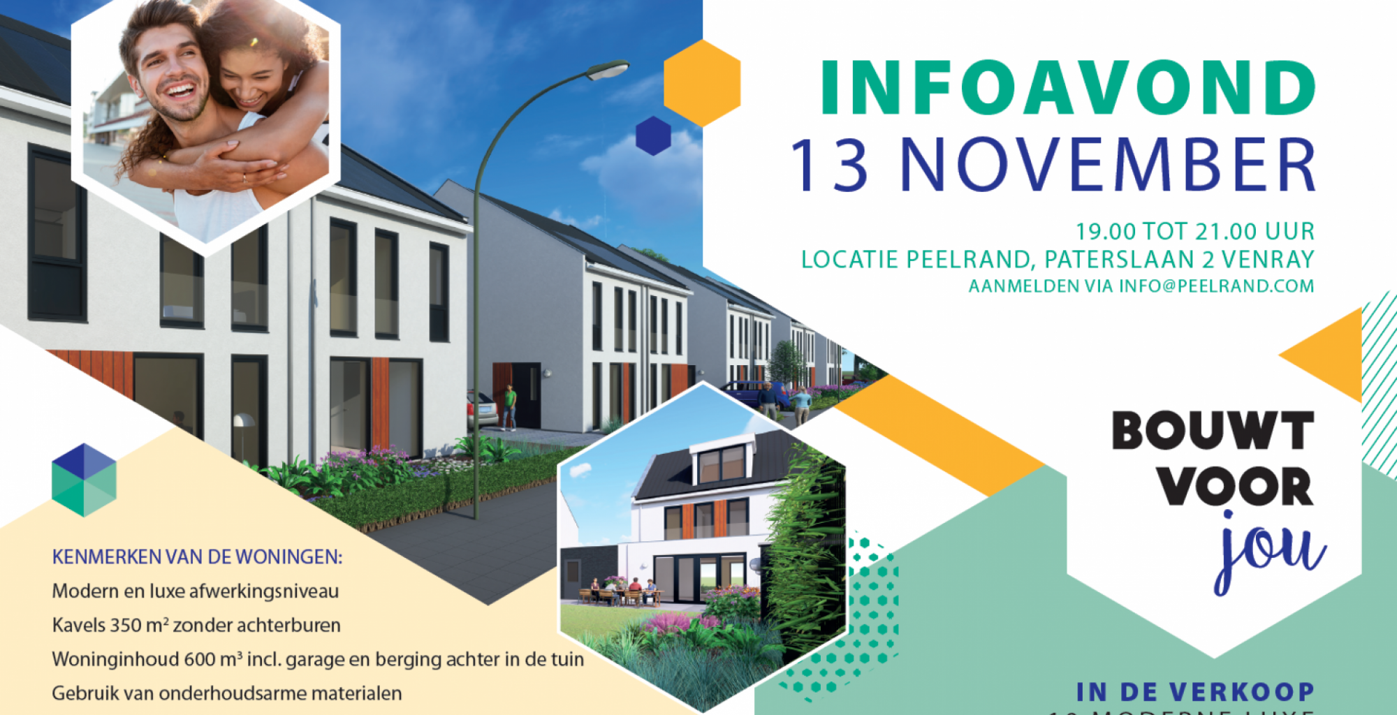 Op een toplocatie in Venray gaan wij 10 moderne en luxe twee-onder-één-kap woningen realiseren. Op dinsdag 13 november organiseren wij, samen met Peelrand Makelaardij en Driessen Architectuur, een infoavond voor belangstellenden.  Bezoekers krijgen tijdens deze bijeenkomst alle informatie die nodig is om een keuze te kunnen maken voor de aankoop van een prachtige nieuwe woning.