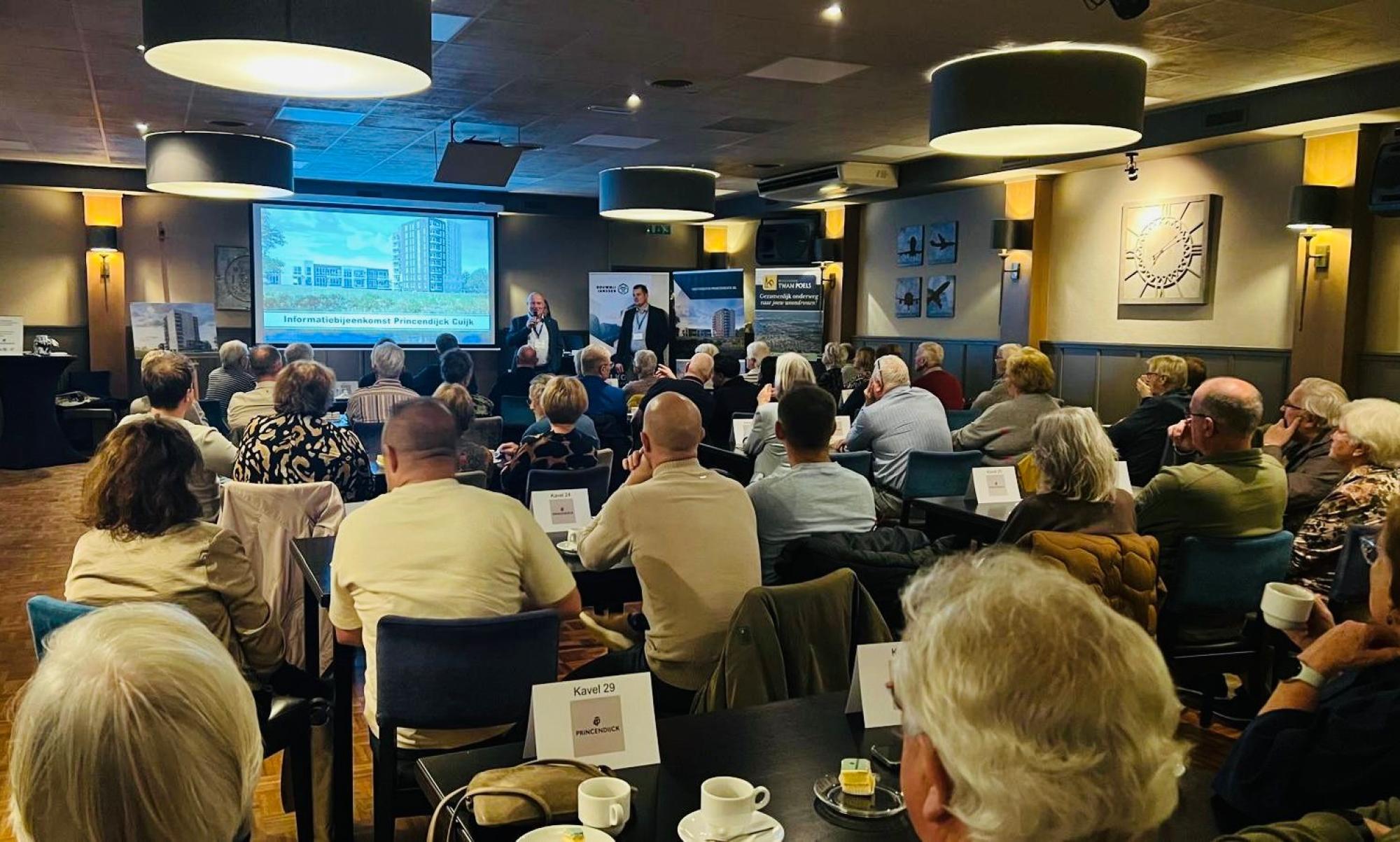 Op een prachtige locatie aan de Maas mogen wij in Cuijk 61 appartementen realiseren. Nagenoeg alle appartementen zijn verkocht en wij organiseerden deze week een kennismakingsbijeenkomst voor de nieuwe, toekomstige bewoners Princendijck. Want dat is de naam van het fraaie complex wat het sluitstuk is van het plan De Cuijkse Cantheelen. De bewoners werden welkom geheten door Bart van Roy en maakten kennis met projectleider Tom Vullings en klantcoördinator Ellie Worms. Ellie vertelde hoe de klantreis van de kopers eruit gaat zien; Tom nam de mensen onder andere mee in de planning. Na het beantwoorden van diverse vragen uit het publiek, werd er gezellig nagepraat onder het genot van een drankje.