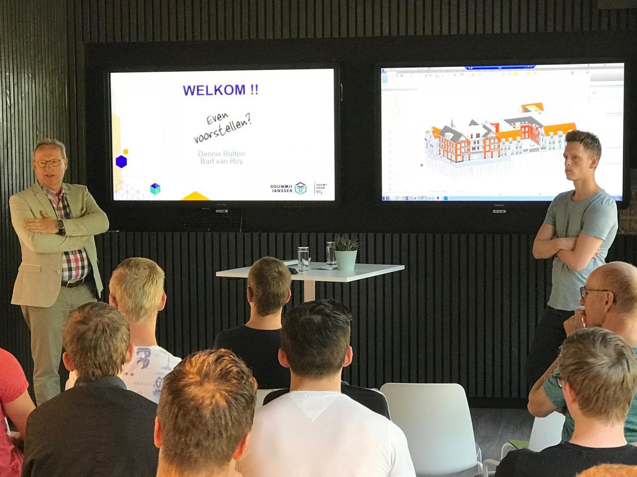 Vandaag brachten ca. 20 3e-jaar studenten Bouwkunde van het ROC te Nijmegen een bezoek aan Bouwmij Janssen. Bart van Roy nam hen mee in de visie van ons bedrijf en vertelde over lean. Dennis Rutten sprak op zijn beurt over BIM binnen Bouwmij en zijn rol als modelleur, met name bij het project Hof van Loon. Na het theoretische gedeelte, vertrok de groep naar Overloon voor een rondleiding over de bouwplaats en werd het gebruik van BIM op deze bouw en de leanplanning nog eens toegelicht.  Mooie gelegenheid om te zorgen voor verbinding tussen onderwijs en het bedrijfsleven.