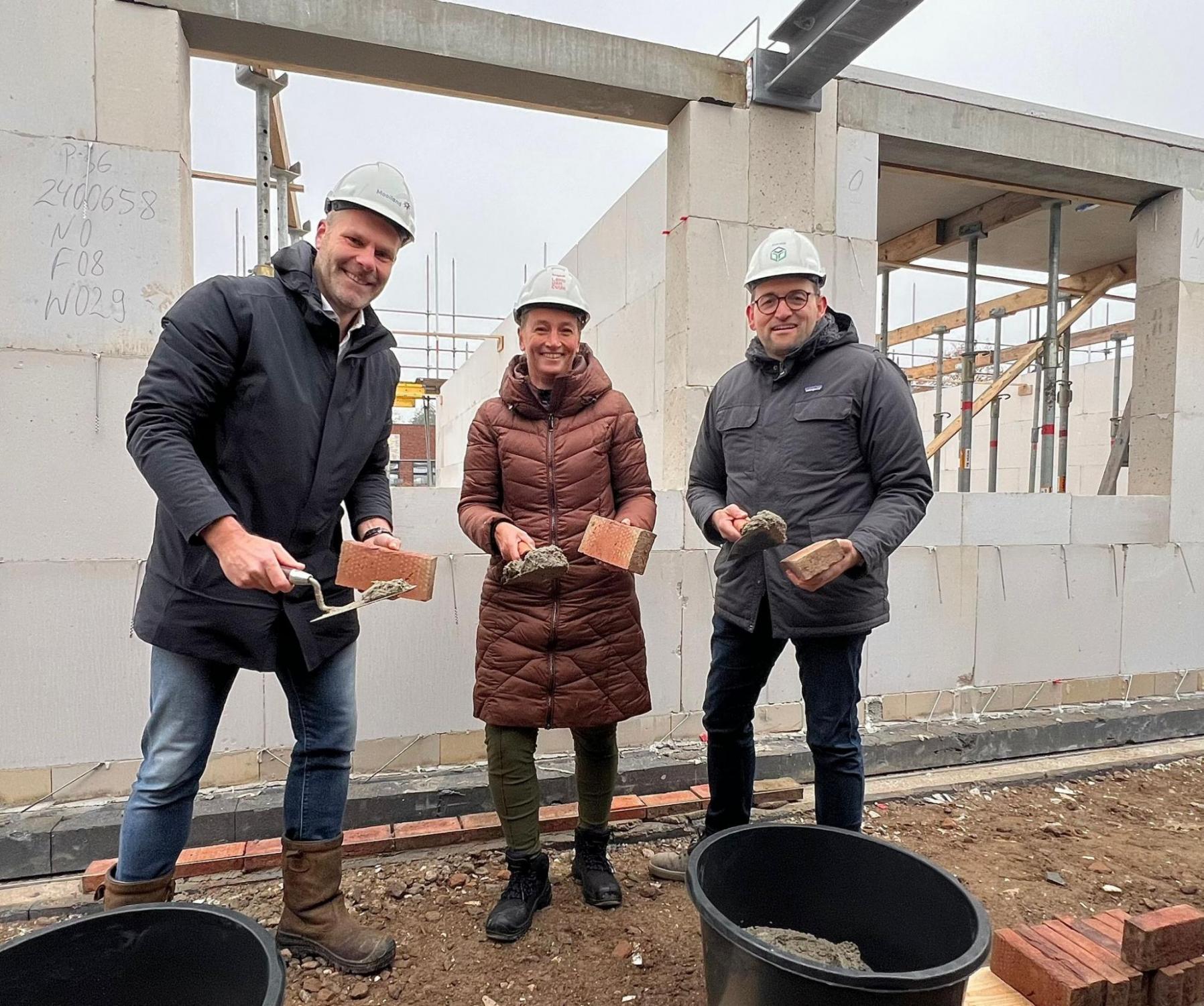 Op donderdag 7 november startten Bart Kivits, directeur Mooiland, Bouke van Vught, wethouder gemeente Land van Cuijk en onze directeur Harold Verrijdt op symbolische wijze de bouw van 20 huurappartementen in de nieuwbouwwijk Cuijkse Cantheelen. Onder toeziend oog van de aanwezigen werden de eerste stenen van het nieuwbouwcomplex gemetseld. In samenwerking met BPD realiseren wij het nieuwbouwplan op deze locatie voor 61 appartementen waaronder 20 huurappartementen voor Mooiland; de andere 41 zijn koopappartementen.